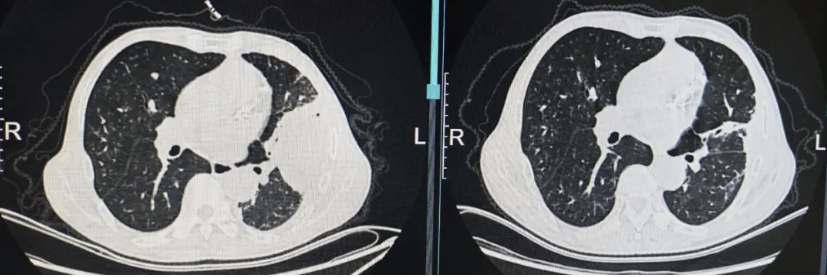 图片4:两性霉素B脂质体静滴治疗28天胸部CT对比左肺实变影基本完全吸收好转。
