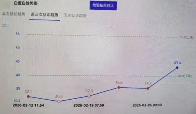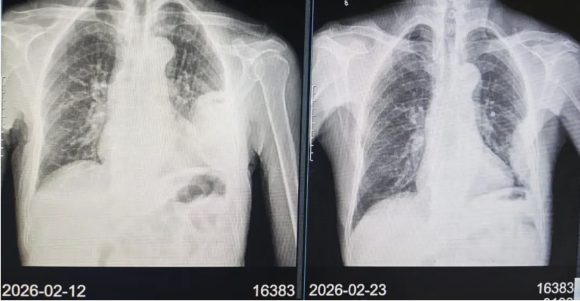 治疗:患者同意参加由中日友好医院牵头,上海市肺科医院为参与单位的临床研究《两性霉素B脂质体 (AmBisome®)联合艾沙康唑与AmBisome®单药治疗肺毛霉菌病的疗效和安全性比较的多中心、前瞻性、开放、随机对照研究》,通过随机化入组了两性霉素B脂质体单药治疗组。2026年2月13日起予两性霉素B脂质体5mg/kg/d静滴治疗,2月16日复查肾功能示血肌酐111.6umol/L升高,考虑肾功能损伤,2月17日起两性霉素B脂质体减量至3mg/kg/d静滴治疗,同时予水化、保肾等治疗。2月19日复查肾功能血肌酐98.7umol/L,较前有下降好转,继续两性霉素B脂质体3mg/kg/d静滴治疗,监测血常规、肝肾功能电解质。2月23日复查胸片示左肺实变影较前有所吸收好转(图片3)。两性霉素B脂质体静滴疗程满28天,2026年3月11日复查胸部CT示左肺实变影基本完全吸收好转(图片4)。2026年3月12日予出院续贯口服艾沙康唑治疗。在药物治疗的同时,营养支持也很重要,患者入院时血生化示白蛋白32.1g/L,前白蛋白120.3mg/L,遵医嘱每日食用3-4个鸡蛋补充蛋白质,出院时白蛋白升至43.4g/L,前白蛋白318.5mg/L(图片5)。