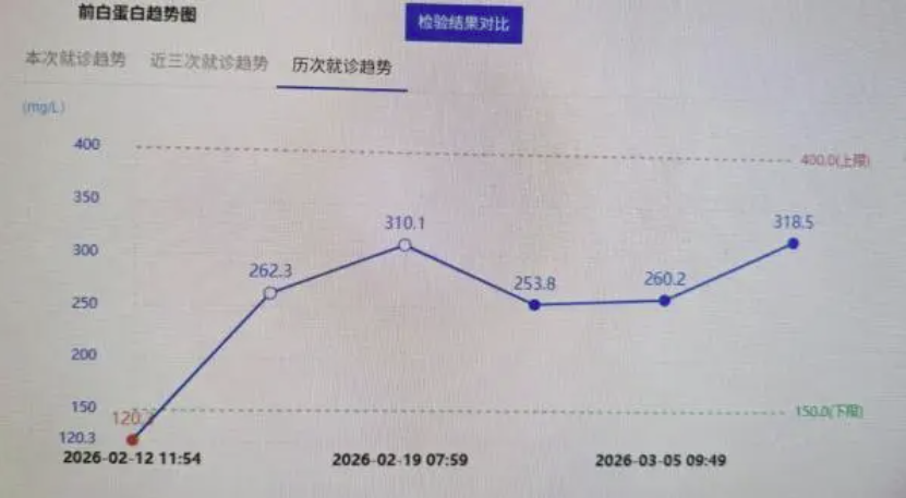图片5:患者在院期间通过营养补充后的血清白蛋白和前白蛋白变化趋势。