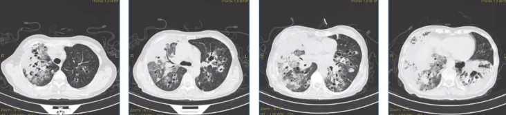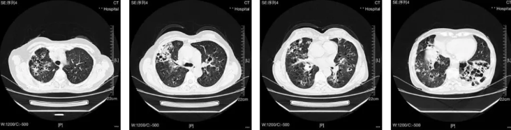 图1:外院A 2025.09.29胸部CT:双肺多发斑片状影和大小不一含气囊腔,支气管血管束增粗。