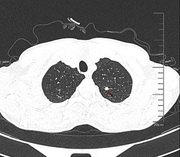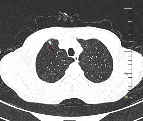 (6)、我院胸部CT:1、右肺上叶后段磨玻璃结节,密切随诊。(Lung-RADS 3);2、余肺内可见多发微小结节,随诊。(Lung-RADS 2)3、右肺中叶不张。右肺下叶背段少许支扩。4、升主动脉横径增宽,径约41mm。