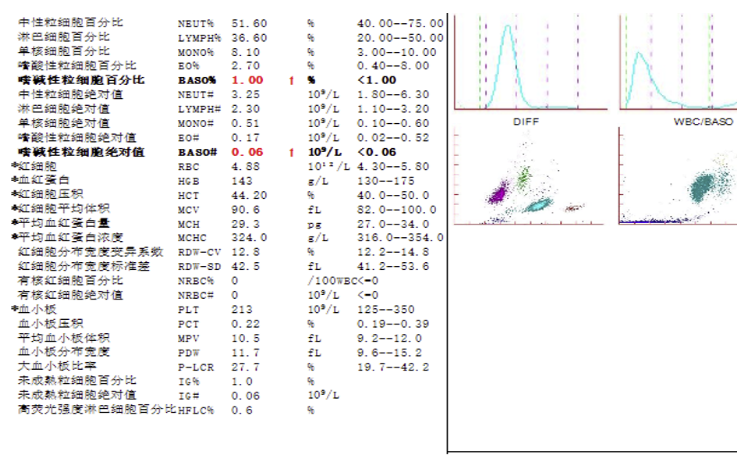 (2)、[2025-06-05]血细胞分析及一般血液学检查:嗜碱性粒细胞百分比 1.00%, 嗜碱性粒细胞绝对值 0.06×10^9/L,中性粒细胞百分比51.60%,中性粒细胞绝对值3.25×10^9/L,淋巴细胞百分比36.60%,淋巴细胞绝对值2.30×10^9/L,白细胞6.29×10^9/L,红细胞4.88×10^12/L,血小板213×10^9/L。