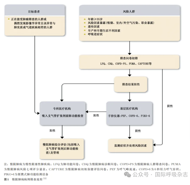 图1展示了慢阻肺病病例发现的2条路径。第一条路径针对目标人群,即正在接受肺癌影像学筛查者或影像学偶然发现肺实质/气道异常者,可直接在专科医疗机构进行确诊性肺功能检查。第二条路径针对高危人群,包括年龄≥35岁、有风险因素暴露、遗传因素、早产史或呼吸系统症状者,首先使用筛查问卷进行预测试,阳性者在基层医疗机构进一步检查,必要时转至专科医疗机构确诊[9]。