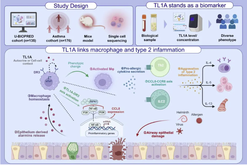 本研究前期研究结果发现肿瘤坏死因子样配体1A(TL1A)是重症哮喘的关键免疫靶标并于多个哮喘表型密切相关。进一步利用单细胞测序技术、基因编辑动物模型及临床样本分析,明确巨噬细胞是过敏炎症背景下TL1A的主要免疫来源细胞。研究证实巨噬细胞TL1A通过激活受体DR3,通过CCL8-CCR8信号轴放大2型炎症反应参与过敏原诱导的气道炎症、嗜酸性粒细胞浸润、Th2型细胞因子分泌及黏液过度分泌。揭示了TL1A在过敏气道环境的诱发因素并利用小动物microCT等技术在慢性重度哮喘模型中验证了抗TL1A中和抗体的治疗效果,其动态影响致病性CD8+效应记忆T细胞在内的免疫细胞,调节先天免疫和适应性免疫,实现多维度的干预。该研究系统阐明TL1A在哮喘发病中的核心作用,证实其作为“生物标志物-治疗靶点”的双重价值,为哮喘精准治疗提供了全新策略。