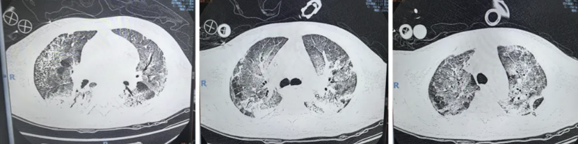将患者转入ICU,并进行气管插管、连接有创呼吸机等急救措施。但即使给予高浓度氧通气,患者氧合指数依然低于150,表现为重度急性呼吸窘迫综合征(ARDS)样表现。为患者开具CT检查,结果显示:双肺出现广泛ILD表现,包括大片磨玻璃影、沿支气管血管束走行的网格影及实变影(图4)。疾病进展速度之快,令团队高度警惕。