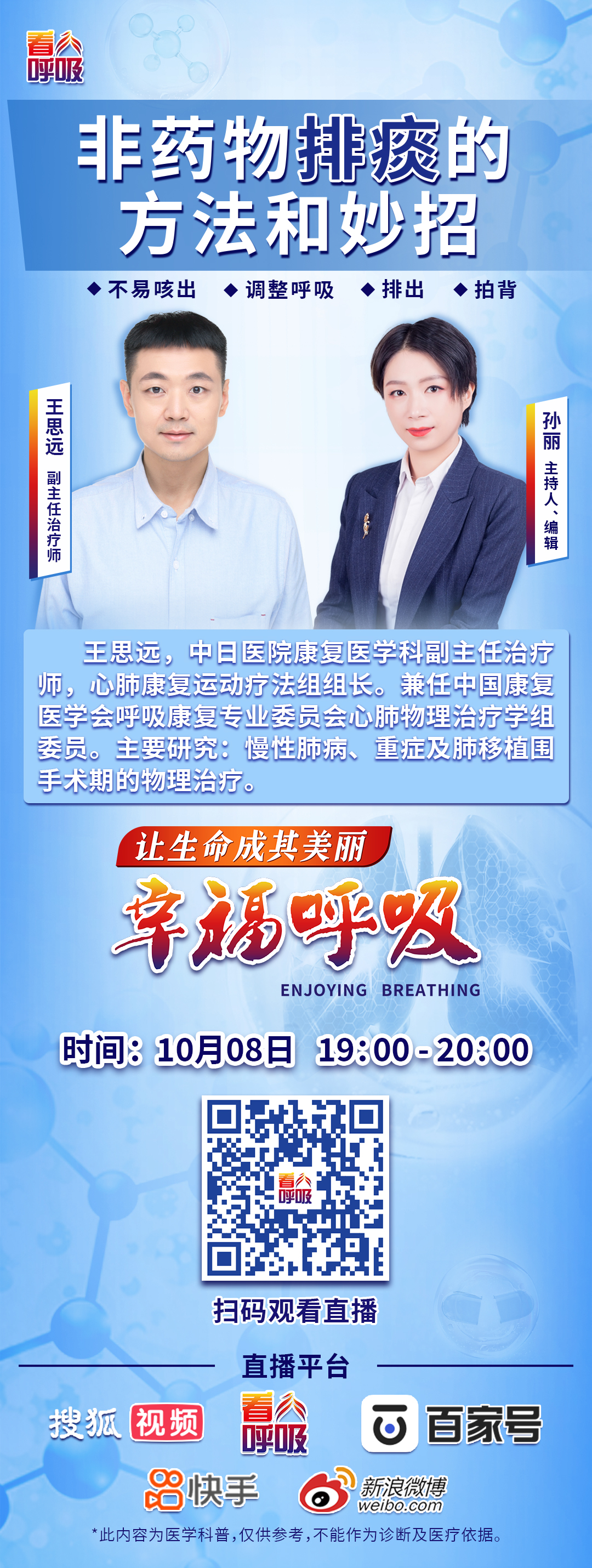 10月8日(本周三)晚19:00,中日友好医院呼吸中心物理治疗师王思远将做客《幸福呼吸》直播间,专门聊聊“非药物排痰的方法和妙招”,从呼吸调整到体位排痰,从气道保湿到特殊人群的排痰注意事项,王思远老师都会细细讲解。