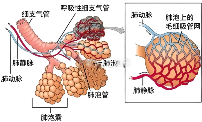 “我打个比喻,你吸烟时,烟雾中的焦油、尼古丁等有害物质会像‘砂纸’一样反复摩擦你的气道,引发慢性炎症,尽管早期可能无症状,但你的肺泡和气道已悄然受损,直到肺泡破裂、气道狭窄。因为我们的正常肺泡像小气球,吸烟会让它们肿胀、破裂,形成‘肺大泡’(见图1),失去弹性,氧气交换效率下降。而炎症导致黏液分泌增多,气道被黏液痰堵住,呼吸越来越费力,这就是气道狭窄。”
