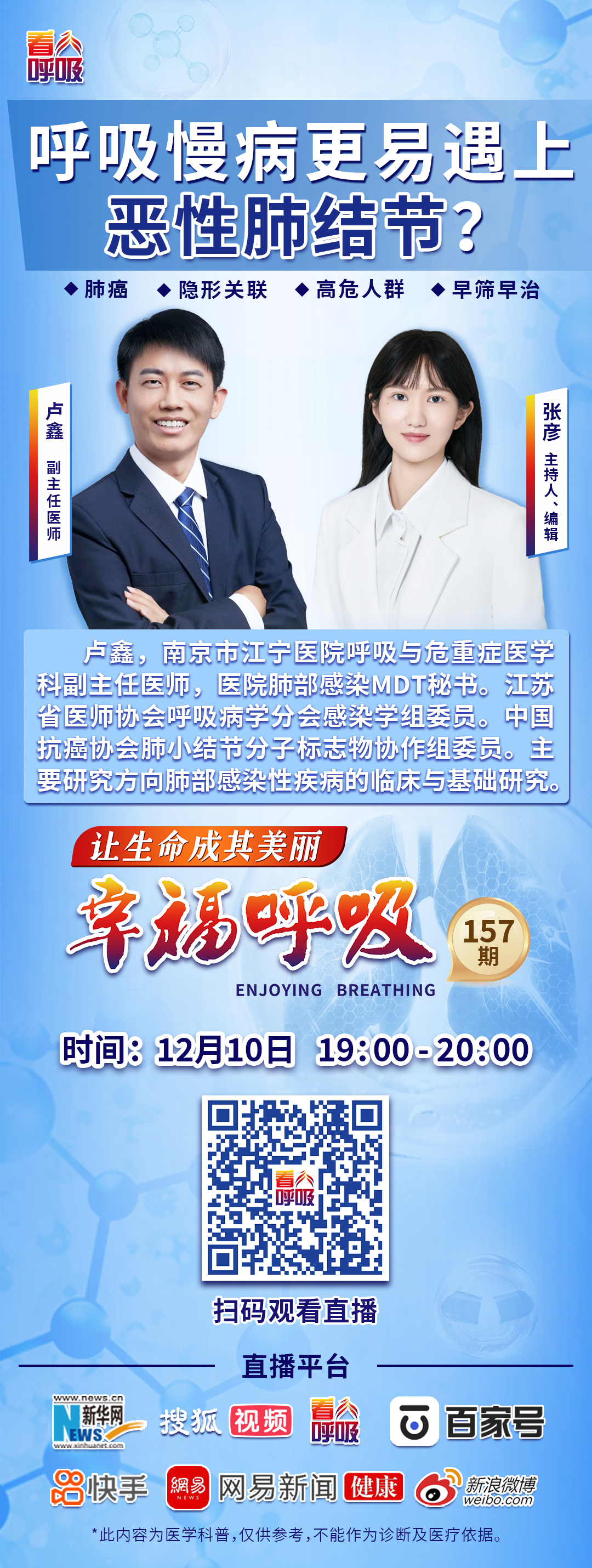 12月10日(本周三)晚上19:00,南京市江宁医院呼吸与危重症医学科副主任医师卢鑫将来到《幸福呼吸》直播间,聊一聊“呼吸慢病更易遇上恶性肺结节?”这一核心话题,结合临床典型案例,拆解呼吸慢病与肺结节的关联逻辑,明确高风险信号与低风险情况的区分标准,同时给出用药、康复、复查等方面的管理建议。