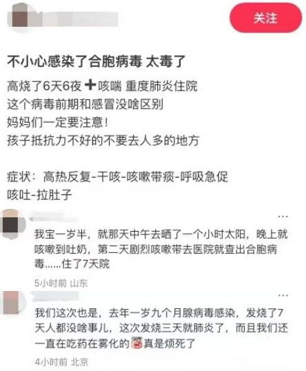 一位宝妈分享了孩子感染呼吸道合胞病毒的经历:孩子重度肺炎住院治疗,持续咳喘,高烧长达六天六夜。评论区中,也有网友提到自家一岁半的宝宝感染后剧烈咳嗽,甚至咳到吐奶。