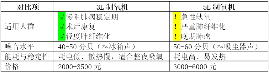 杜医生告诉我们,这是因为3L的制氧机流量主要在0-5L之间是可调的,这才是适合大多数老年人居家氧疗的容量,它在每分钟3L的流量下能够稳定地输出90%以上医用氧,足以覆盖老年人的日常需求。杜医生还专门为我们制作了一张图表,一目了然: