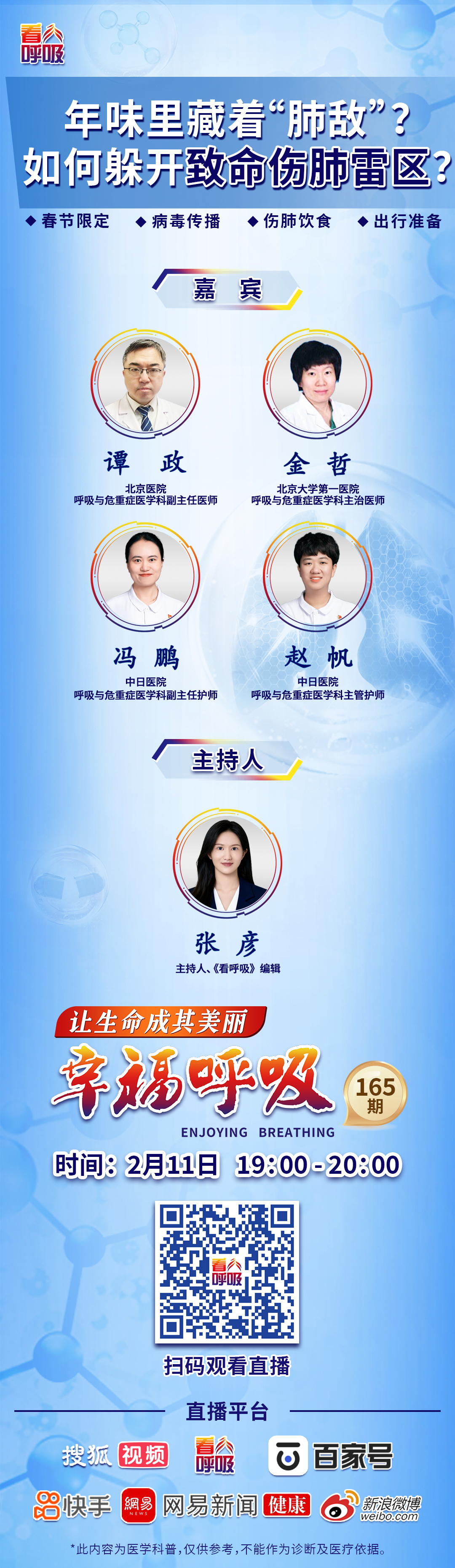 2月11日(本周三)晚上19:00,《幸福呼吸》科普直播栏目将和大家聊聊“年味里藏着‘肺敌’?如何躲开致命伤肺雷区?” 。