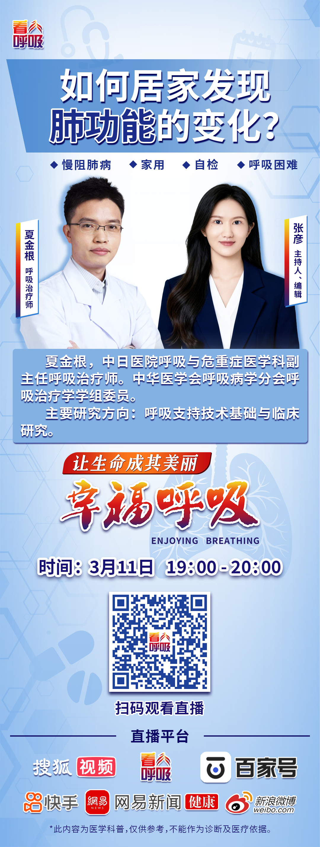 很多病友觉得特意去医院检查肺功能“太不值当”,为了帮助大家像王大伯一样 、 足不出户就从肺功能的变化里发现早期的疾病警报 ,3月11日(本周三)晚19:00,中日医院呼吸与危重症医学科副主任呼吸治疗师夏金根将做客《幸福呼吸》,聊一聊“如何居家发现肺功能的变化?”。