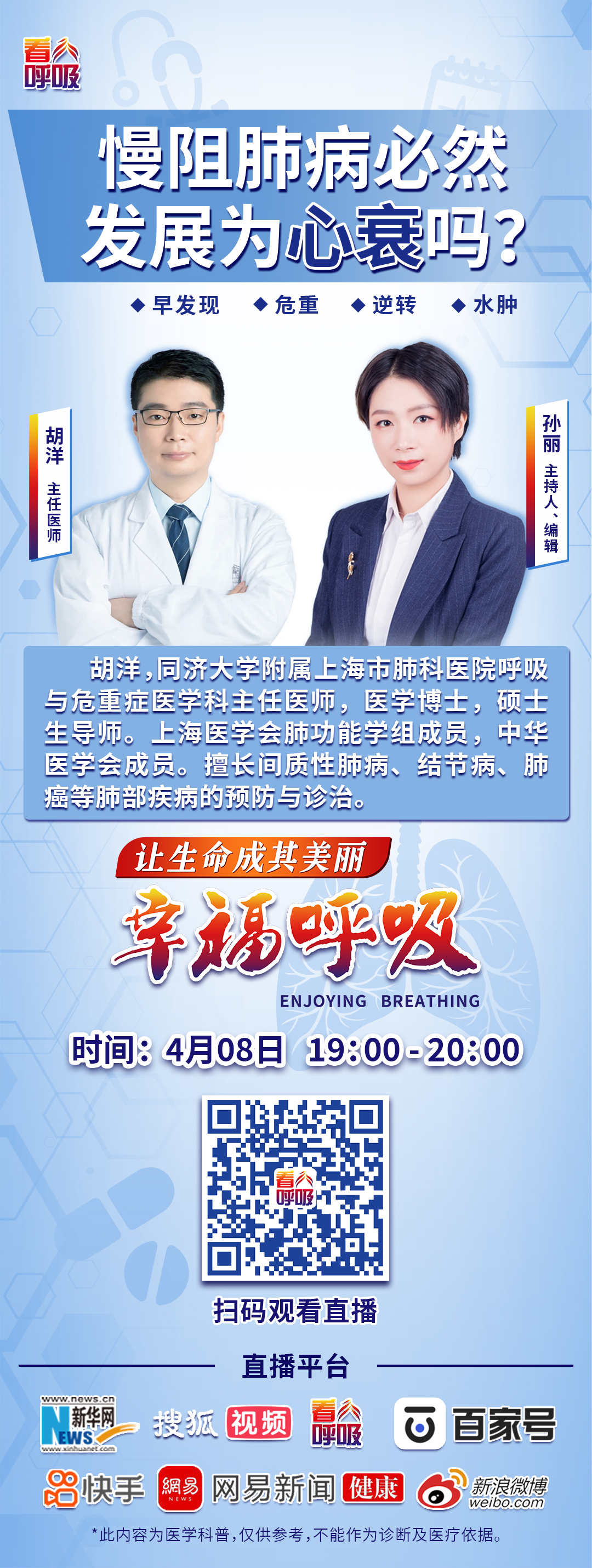 4月8日(本周三)晚上19:00,同济大学上海市肺科医院呼吸科主任医师胡洋将来到《幸福呼吸》直播间,深入聊一聊“慢阻肺病必然发展为心衰吗?”,分享实用的“贴‘心’指南”,教大家早发现、早预防、早干预,守护好心脏健康。