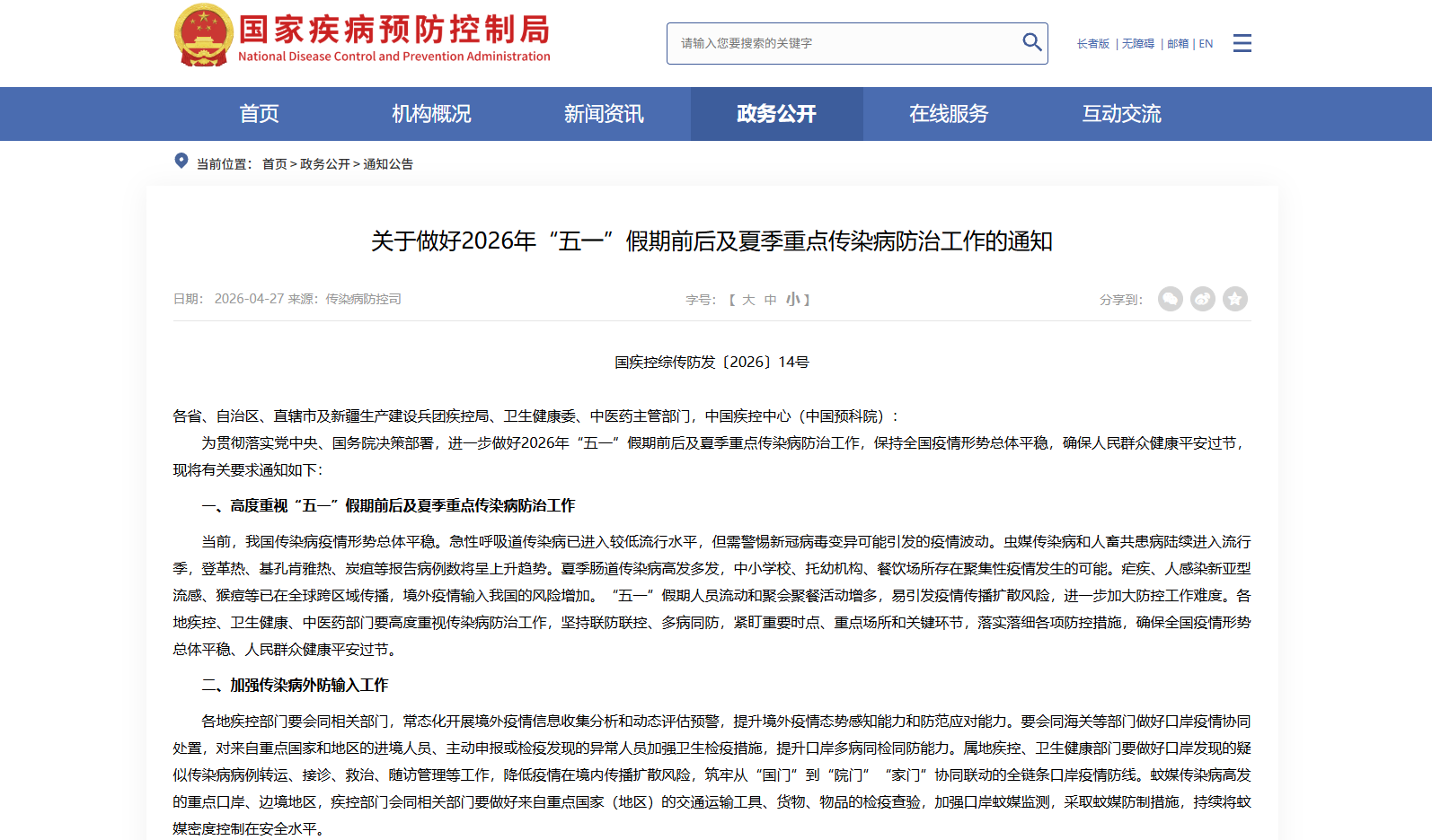 刚刚,国家疾病预防控制局发布《关于做好2026年“五一”假期前后及夏季重点传染病防治工作的通知》并做解读。